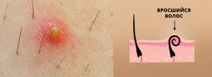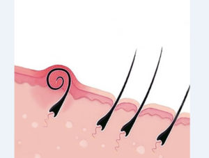 - появу горбка на шкірі з затемненням при закручуванні врослого волосини;
