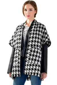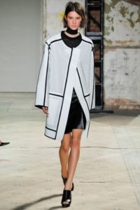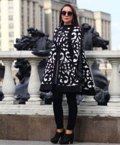 чорно-білий кейп. Виріб, що представляє собою накидки з прорізами для рук або вільно спадаюче з плечей. Схоже з пончо, але більш щільне і зшито не просто у формі пелерини, а саме у вигляді вироби верхнього одягу. Прообраз моделі був широко поширений в середні століття, в XX столітті дизайнери дали йому нове життя. У поточному сезоні кейп повертається в моду, деякі варіанти вироби представлені на фото нижче;