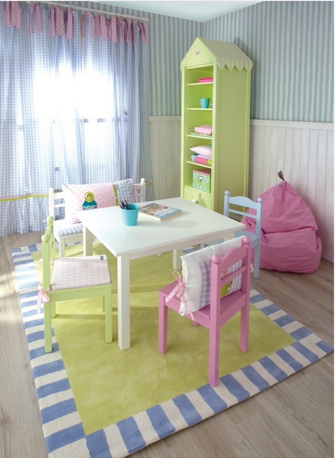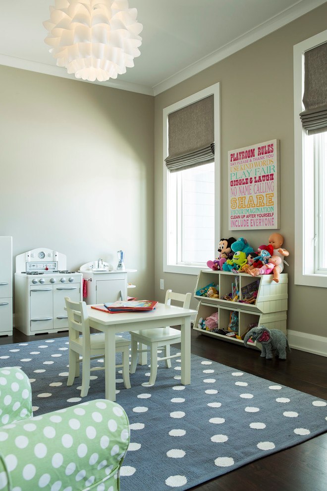 Самим оптимальним варіантом будуть м’які спокійні тони. Вони заспокоюють і не стомлюють погляд, а яскраві іграшки і меблі не створять каламбуру фарб в оточенні світлих стін. Різнокольорові іграшки та килимки цікаво виглядатимуть на однотонному підлозі.