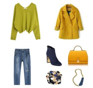 Більшість дівчат, самостійно складають свої образи, звертаються до колірного спектру. Він представлений колом, поділеним на кольорові сектори. Для створення яскравого контрастного образу рекомендується поєднувати кольори, що знаходяться навпроти. Якщо придивитися і знайти в спектрі гірчицю, то можна побачити, що вона поєднується з синіми і фіолетовими відтінками.