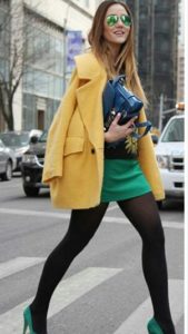Якщо хочеться внести в образ трохи фарб і при цьому зробити акцент саме на взуття, то можна надіти, наприклад, зелені туфлі, але при цьому пальто повинно бути коротким і повністю приховувати спідницю.