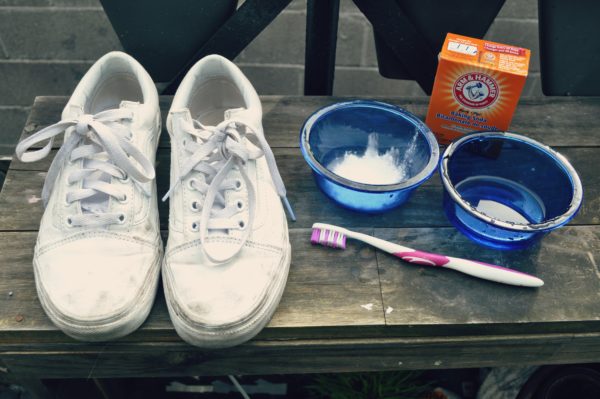Паста з прального порошку і гелю для посуду — це відмінний відбілювач для взуття. Достатньо лише нанести її на поверхню кедів і ретельно пройтися щіткою. Потім прополоскати чистою водою.