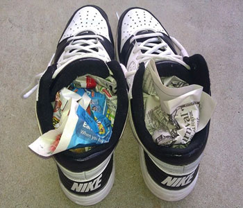 Швидко висушити взуття таким способом можна, щільно набивши папір всередині взуття — це дозволить зберегти їй акуратну форму.