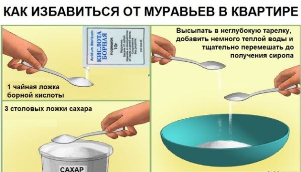 Для приготування засобу для виведення мурах знадобиться по 1 чайній ложці борної кислоти і цукру. Розводимо суміш в стакані води і обмазуємо плінтуса і стежки мурашок.