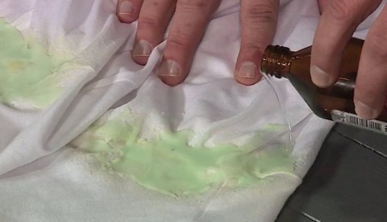 Розчин (1:1) з етилового спирту і нашатирю впорається зі складними плямами. Склад наносять втирающими рухами, а потім простирывают річ у холодній воді.