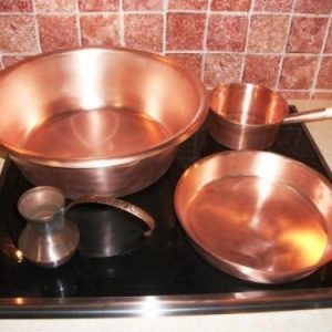 Ці матеріали володіють також властивостями міді. Мідний посуд у всі часи користувалася популярністю за рахунок своїх якостей. Мідь добре проводить тепло і завдяки цьому їжа дуже швидко готується і проварюється, прожарюється повністю. Слід зазначити, що поверхня посуду повинна бути луженной.