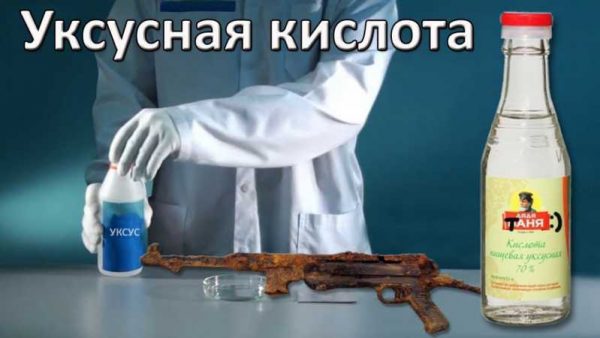 Білий оцет. Оцтова кислота вступає в реакцію з корозією і розчиняє її. Для застосування такого способу необхідно металевий виріб залишити на пару годин в білому оцті. Після чого розмоклу іржу треба зішкребти. Великі предмети, які неможливо повністю опустити в це засіб, необхідно обробити оцтовою есенцією, налив її на забруднену поверхню і залишивши на 2-3 години. Або просто кілька разів інтенсивно протерти жорсткою губкою металевий виріб. Замінити білий укус можна звичайним, при цьому результат буде таким же.