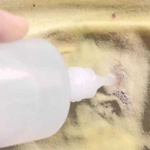 Щоб позбутися від маленьких цяток, слід піпеткою капнути засіб прямо на забруднення, а через 10 хвилин відтерти ваткою слід. Змивають перекис дуже холодною водою, а після застирывают річ.