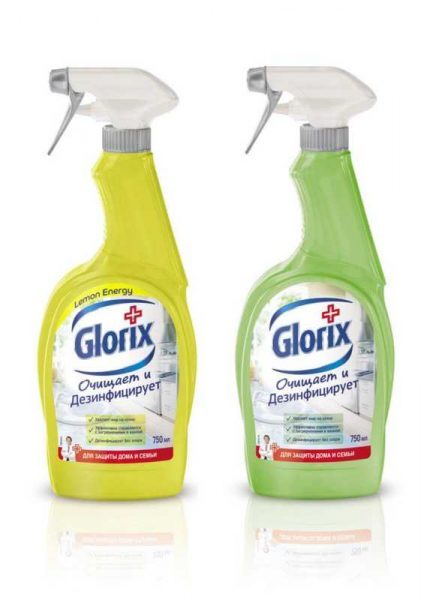 - Glorix – зручний засіб у вигляді спрею. Потрібно розпорошити на що потребує очищення поверхню і протерти ганчіркою. Ця речовина добре дезінфікує поверхню від небажаних мікроорганізмів і знищує цвілеві гриби.