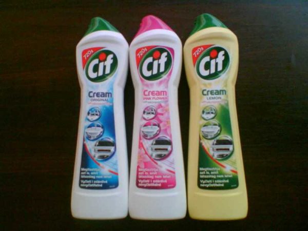 - Cif Cream – кремоподібна потужний засіб, що зручно застосовувати як проти забруднень на кухні, так і у ванній.
