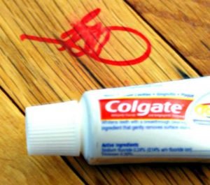Якщо невідомо, яким типом чорнила було залишено пляма, то можна використовувати універсальний засіб – зубну пасту. Це засіб гігієни ротової порожнини у більшості випадків дозволяє відтерти маркер будь-якого виду, потрібно лише озброїтися зубною пастою, двома ганчірочками і водою. Далі слідувати нескладним послідовності дій: