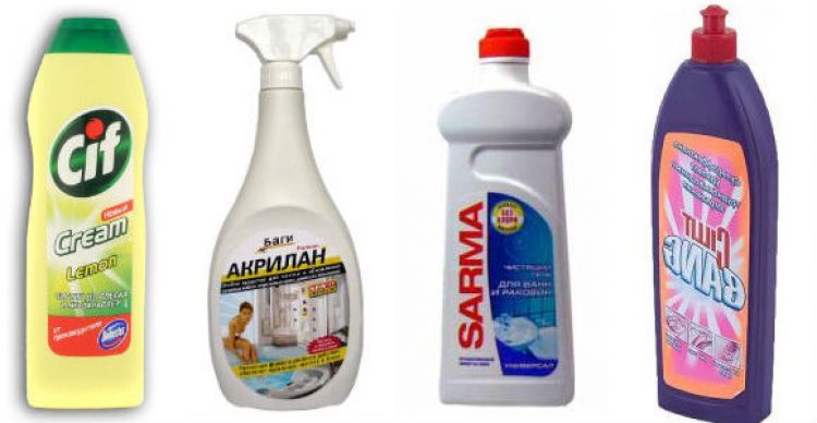 В допомогу господиням виробниками побутової хімії пропонуються спеціальні засоби, що полегшують догляд за акриловою ванною. Це гелі та пасти: