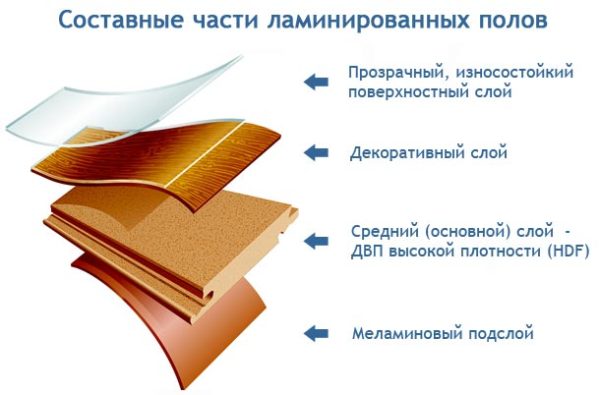 Для початку трохи теорії. Підлогове покриття, яке ми звикли називати ламінатом – це спресовані під тиском і великою температурою панелі з МДФ або ДСП, паперу та меламінових смол.