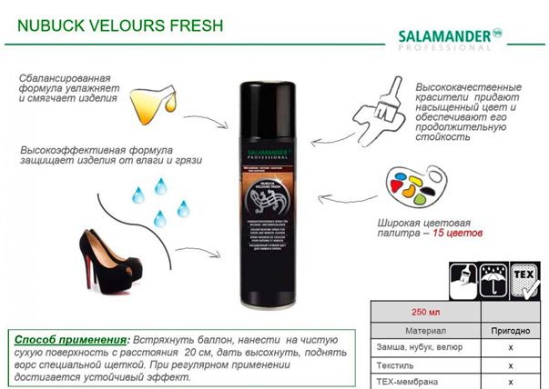 Інструкція по використанню Salamander Professional Nubuсk Velours Fresh (ціна – від 450 руб.)