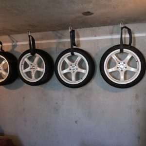 Зберігати гуму в гаражі не надто безпечно, особливо якщо гараж металевий. Температура влітку перестрибує відмітку +35 градусів. У ґрунтовних гаражах зручно робити в гаражі полиці під стелею або навісні кріплення для зберігання. Колеса підвішуються за середину диска. Тут єдиний нюанс — в місці зіткнення металу з дисками потрібно прокласти прокладку, щоб уникнути корозії і зминання дисків.