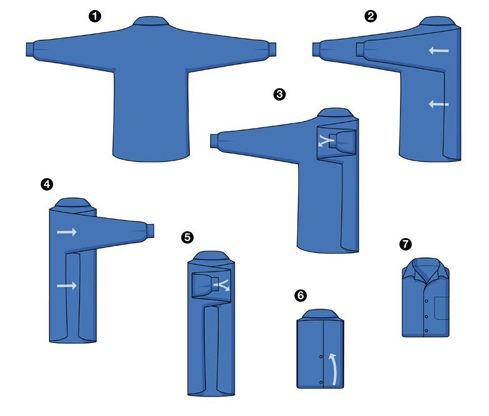 Керуючись тим же принципом можна скласти сорочку. Але щоб вона не пом’ялася, доведеться повозитися з рукавами. Якщо виробити вправність, то і це буде даватися без проблем.