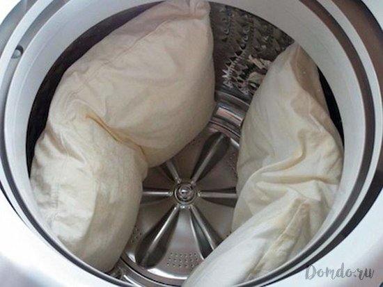 Необхідно пам’ятати, що машинне прання може стати причиною утворення грудок всередині подушки. Щоб уникнути цього її можна прати з іншими предметами. Якщо є сумніви, що виріб витримає машинне або ручне прання, подушку краще здати в хімчистку.