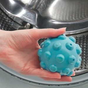 Завантажте пуховик в барабан пральної машини. Туди ж покладіть 3-4 кульки для прання білизни, щоб вони в процесі прання запобігли збивання пуху в грудки. Менша кількість кульок не дасть потрібного ефекту. При бажанні можна замінити кульки тенісними м’ячиками (для великого тенісу). Тільки не забудьте попередньо потримати їх 1-2 години в будь-якому відбілювачі, інакше барвник може зіпсувати одяг.- Замість прального порошку використовуйте рідкий миючий засіб або гелеві капсули – звичайний порошок погано выстирывается і залишає мильні розлучення на тканини.