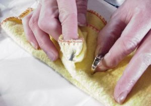 Спочатку злегка змочіть матерію, після умочіть її в порошок. Почніть протирати виріб, намагаючись видалити з нього темні плями. Врахуйте, чистка зубним порошком повинна проходити повільно і акуратно, так як срібло – м’який метал і дуже легко дряпається.