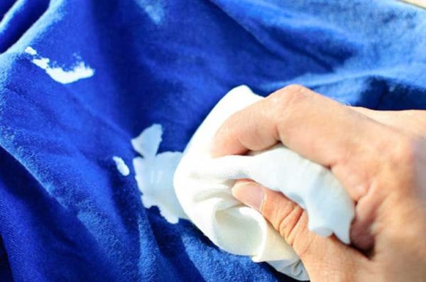 Зробіть розчин з нашатирю і води в пропорції 2 до 1. Рясно змочіть ватяний диск в суміші і потріть забруднену ділянку. Залиште річ на 30 хвилин і сполосніть під проточною водою.