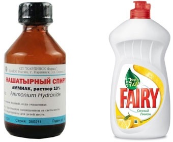 - вам потрібно розвести 1 ложку засобу для посуду і 1 ложку нашатирю з теплою чистою водою (100 мл);