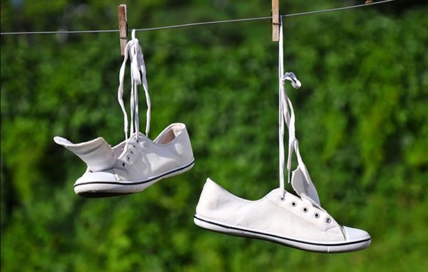 Після прання вам необхідно подбати про правильну сушінні взуття. Повісьте кеди в сухому теплому місці з великою кількістю повітря. Краще всього повісити їх за язичок, або як показано на фото.