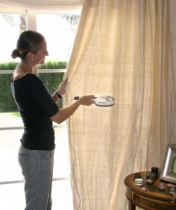 Як тюль, так і штори можна пропрасувати, використовуючи відпарювач. У цьому випадку вони ще і дезінфікуються, що особливо важливо буває для дитячої кімнати. Отпарьте прямо на вазі, не знімаючи фіранки з гардин. Потрібно стежити за тим, щоб в руці пристрій лежав правильно, інакше з нього почне виливатися вода.
