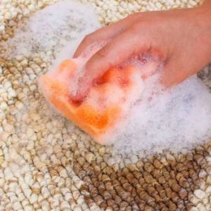 Після видалення плям килим протирають миючим розчином, а потім просто мокрою губкою.