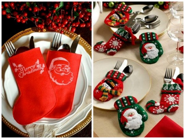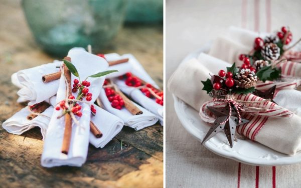 - Серветки. Тканинні набори для сервірування святкового столу складаються з серветок, разлаживаемых на тарілки, доріжок. Доповнити серветку можна спеціальними кільцями або стрічками, що підтримують стилістику свята і колірну гамму.