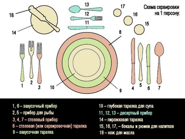 - Прилади. Розкладаються в кількості, що дорівнює кількості поданих страв по обидві сторони. Праворуч – ложки і ножі, зліва – вилки. Чайну ложку дозволяється класти зверху.