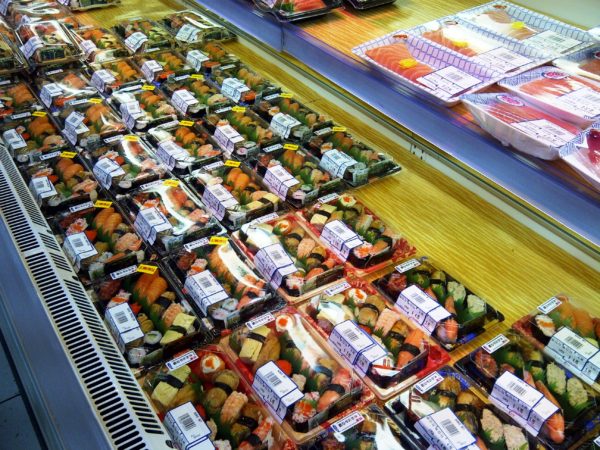 У великих магазинах і японських ресторанах можна зустріти спеціальні холодильники для суші, в яких продукт зберігається в маленьких пластикових контейнерах (приклад на фото нижче).