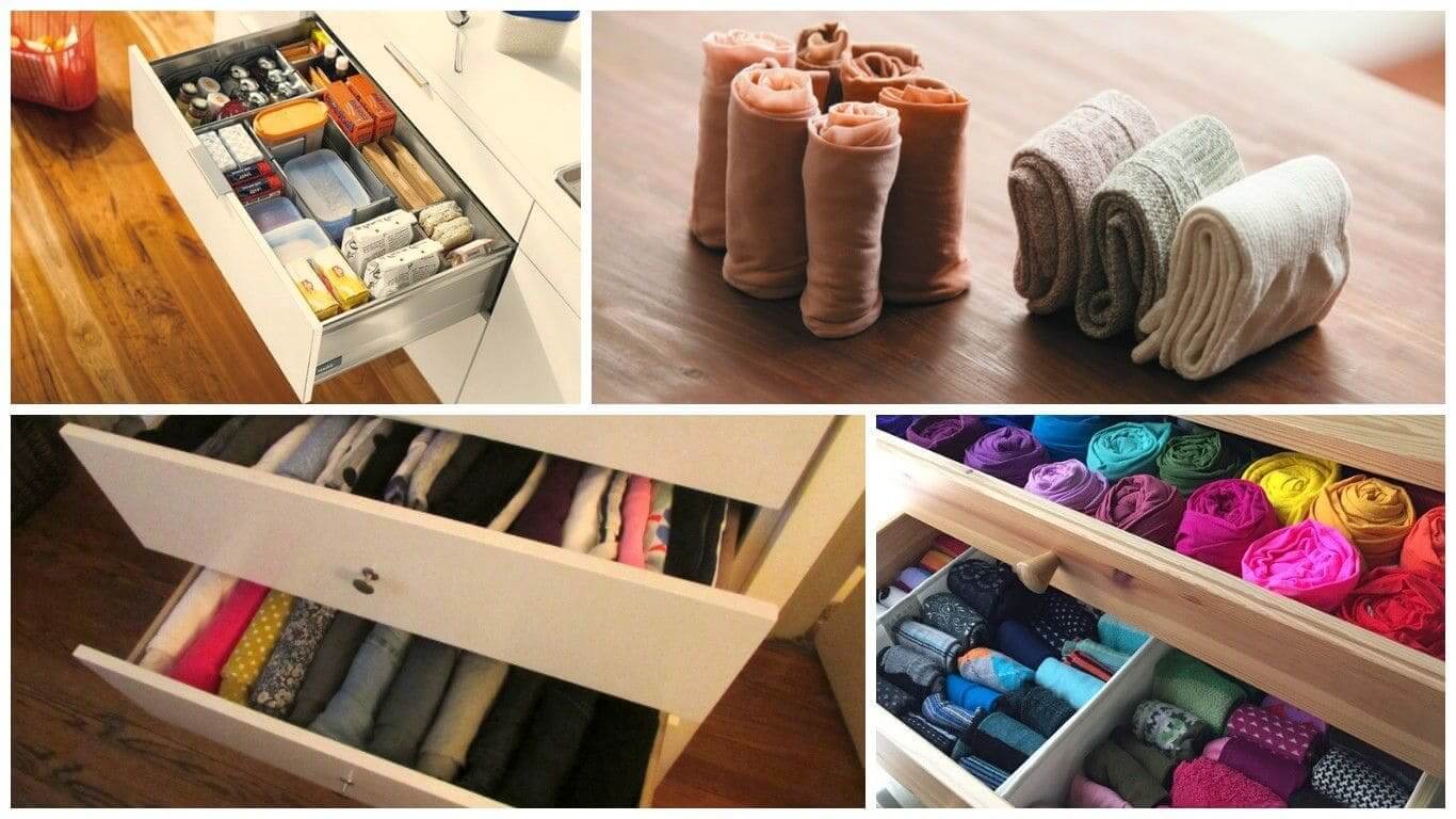 - Вертикальне зберігання. Марі радить вертикально зберігати не лише книги, документи та папери, але і одяг, постільна білизна і т. д. Так, відкривши шафу, завжди можна знайти потрібну річ. Пам’ятайте про те, що майже всі речі можна скласти в акуратний прямокутник або рол.