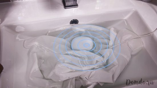 Користуватися пральною ультразвукової машинкою дуже просто. Досить помістити її в центрі наповненою брудними речами і водою з миючим засобом ємності і підключити до електромережі. При цьому розміри посуду для прання і її матеріал не мають значення. Підійде скляна банка, ванна, ківш, таз із пластику, дерева або металу. Єдина умова для якісного прання ультразвуком – об’єм води повинен бути таким, щоб речі в ній вільно плавали.