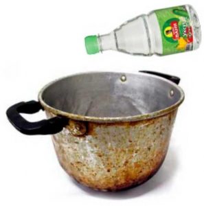 Оцет. Цей продукт практично завжди буває під рукою. Застосовувати його досить просто. Для цього потрібно налити оцет в каструлю і почекати протягом 2 годин, потім злити рідину і промити посуд звичайним методом. З алюмінієвих виробів будуть одночасно видалені і темні плями. В емальованій каструлі не варто залишати оцет в чистому вигляді: він може пошкодити емаль. У цьому випадку слід зменшити концентрацію продукту, а саме розвести водою.