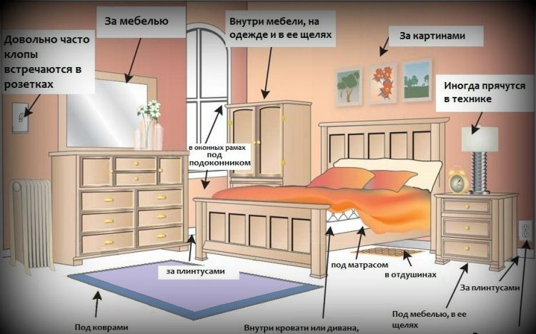 Починати пошуки треба зі спальних місць – улюбленого житла клопів. Якщо в будинку нещодавно з’явилась чужа меблі, наприклад, антикварний комод або старе крісло, найімовірніше, комах занесли з цими речами. Потрібно розібрати і уважно оглянути меблі, особливо шви, кути, місця з’єднання оббивки. Також необхідно перевірити плінтуси, відстаючі шпалери, щілини в підлозі і стінах – комахи можуть мігрувати з сусідньої квартири. Якщо клопи оселилися в квартирі давно, вони можуть влаштуватися в книгах, шторах, електричних розетках, меблів, при цьому в будинку відчувається особливий запах, що нагадує аромат коньяку або мигдалю, але зовсім не приємний.