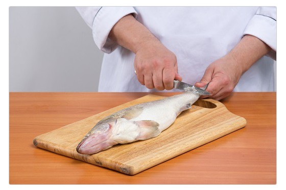 Гострим ножем зрізують плавники, голову, якщо її не потрібно використовувати за рецептом. Тримаючи тушку за хвіст, зчищають луску після обробки окропом. Працюють тупою стороною ножа, роблячи в напрямку хвоста різкі рухи.