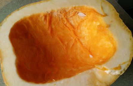 - Якщо вам необхідно зберегти почищену гарбузову м’якоть, видаліть серцевину з насінням і поставте овоч в холодильник. Подвявшие краю можна буде з легкістю зрізати. Не рекомендується використовувати харчову плівку, так як на гарбузі утворюється цвіль.