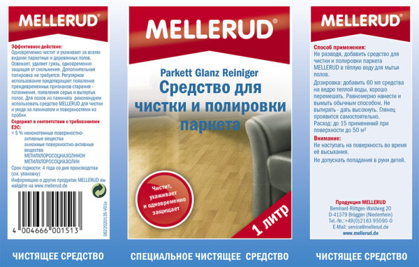 Засоби підбираються теж спеціальні – саме для паркету. Вони утворюють захисну блискучу плівку, полірують дощечки і закривають щілини.