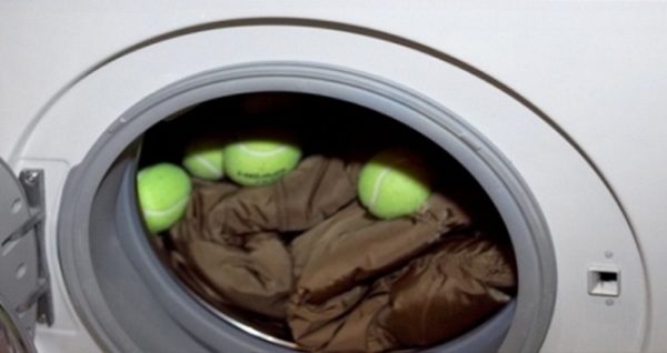 - Закиньте в барабан 3-4 тенісних м’яча. Завдяки їм забезпечується рівномірний розподіл пуху в куртці під час прання.
