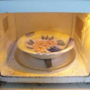 - Вода – для того щоб провести профілактичний догляд за піччю без наявності сильних жирових відкладень і патьоків від разбрызгиваемой їжі, необхідно помістити глибоку чашку з гарячою водою в мікрохвильовку і далі діяти як описувалося раніше.