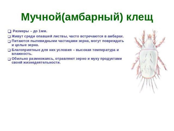 Амбарний кліщ небезпечний тим, що свої продукти життєдіяльності залишає в борошні і зернових