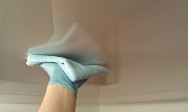Догляд за натяжними глянцевими стелями в принципі не складний. Єдина складність — домогтися відсутності розлучень після миття, адже натерти еластичне полотно, не має під собою твердої основи, проблематично.