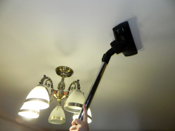 - Видалення пилу. Спочатку за допомогою пилососа, швабри або м’якою волоті прибираємо зі стелі пил, павутину. Найкраще з цим завданням впорається пилосос, яким зручно чистити кути і місця навколо світильників. Але потужність агрегату повинна бути невеликою.