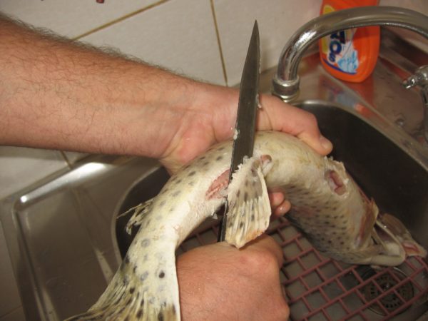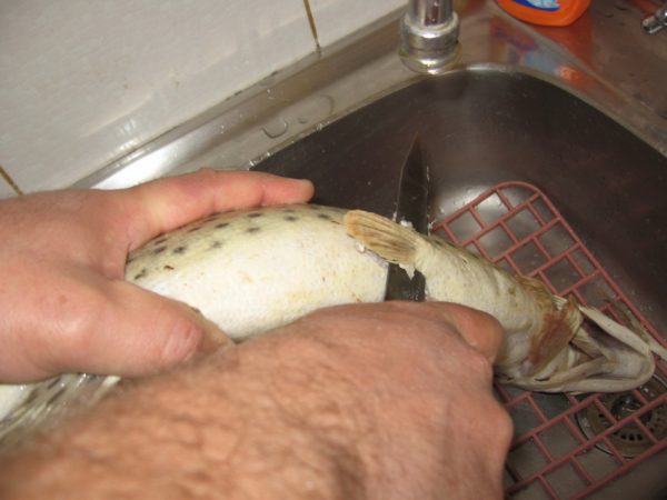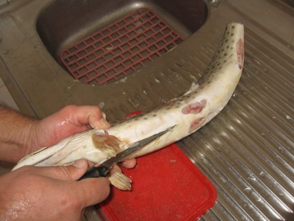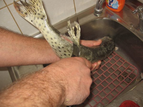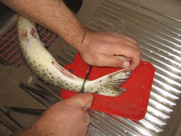 Після того як риба очищена від луски і вимита, необхідно зрізати спиною плавці і хвіст. Зробити це буде простіше тим же гострим филейным ножем, яким видалялася луска.
