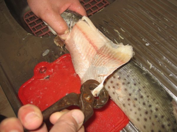 - За допомогою щипців акуратно стягнути шкіру з риб’ячої тушки, притримуючи за голову. Зазвичай знімають шкуру з боку голови, але можна і з хвостової частини, якщо так буде більш зручним. Принципового значення це не має.