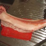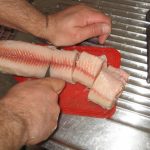 - Далі, відокремити з одержаних шматків шкіру, поклавши їх на дошку шкірою до столу і повільно зрізати ножем. Необхідно пам’ятати, що шкіру потрібно знімати починаючи з хвоста і діяти при цьому дуже акуратно. Якщо шкіра пошкодитися видалити її буде набагато складніше.