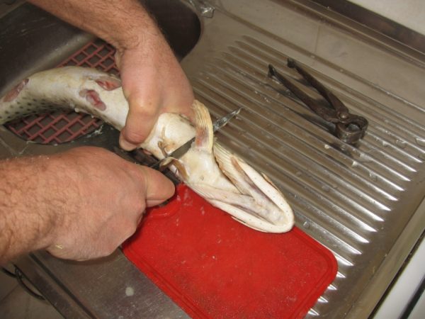 Щоб видалити нутрощі потрібно розпороти щуку черево. Для цього роблять невеликий надріз біля голови, а потім поступово і плавно рухаються до хвостової частини до анального отвору. Розрізати шкіру на череві потрібно акуратно, не встромляючи ніж глибоко в тіло рибини, так як це може привести до пошкодження жовчного міхура і псуванню м’яса.