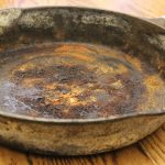 На жаль, навіть у хорошої господині на стінках і дні чавунної сковороди з часом утворюється нагар. У запущених випадках шар стає товстим і тріскається. Навіть у цьому випадку сковороду пробуємо врятувати.