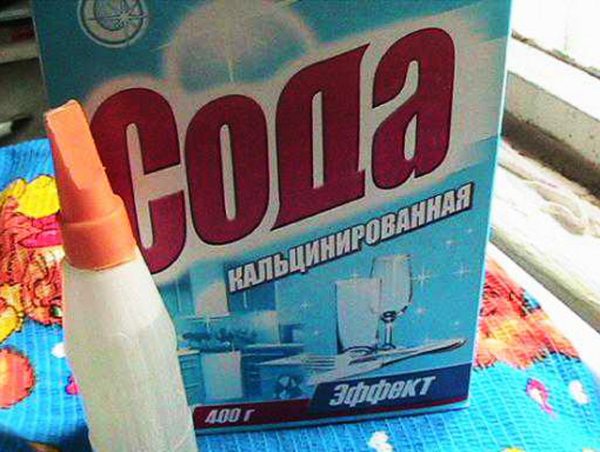 Ефективність цього способу полягає у використанні канцелярського клею, до складу якого входять речовини, здатні роз’їдати застарілий жир і нагар. Кальцинована сода й мило посилюють його дію. Залишиться тільки підчистити сковороду і вимити.