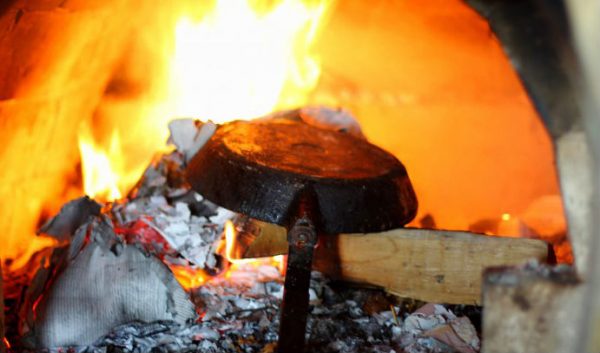 Якщо є пічка, вытапливаемая дровами, можна чавунну сковороду помістити в топку, щоб вогонь випалив нагар. Можна замість печі використовувати мангал. Після такої обробки залишиться помити сковороду.